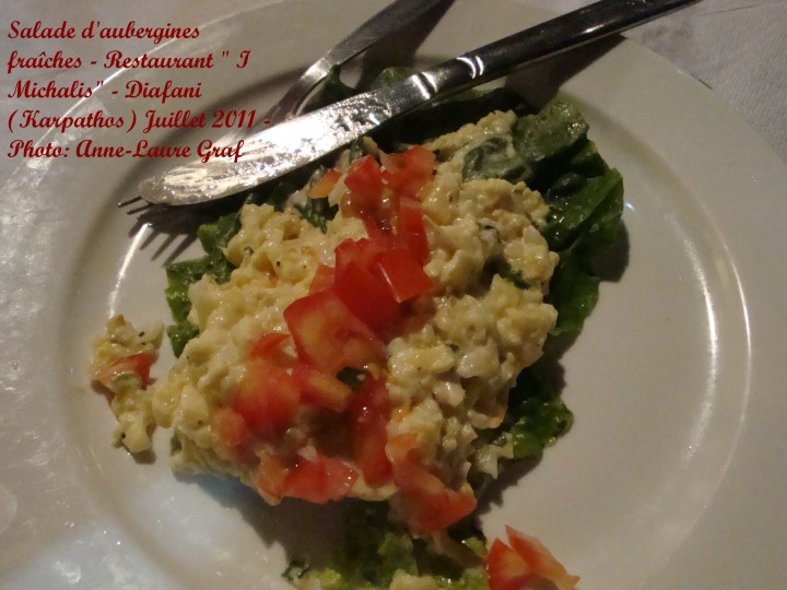Côté entrée, indéniablement la salade d’aubergines. Mais méfiez-vous, celle que l’on vous présente qui ressemble à du yaourt avec des fins morceaux d’aubergine n’est pas faite maison. Il m’aura fallu attendre 3 voyages avant d’en découvrir une fraîche, à Karpathos, chez Michalis. D’ailleurs ce restaurateur musicien m’a réconciliée avec la cuisine grecque.