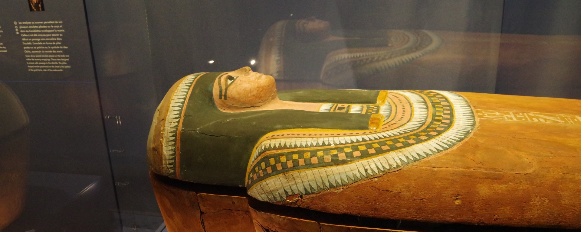 L’exposition débute par une pièce de toute beauté, le sarcophage de Nesperennub (-800 av JC), prêtre « ouvreur des portes du ciel » à Karnak. On y voit la déesse Nout entourer le défunt de ses bras. L’objet apparait alors comme la porte ouverte sur des humains.