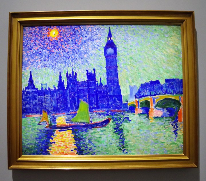 L’exposition prend la forme d’un voyage… On a l’impression de (re)découvrir la célèbre capitale de l’Angleterre sous différents points de vue et angles. On reconnaît certains monuments connus comme le Parlement et Big Ben mais le visiteur découvre aussi la façon dont les Anglais s’habillent, se tiennent ainsi que des lieux peu connus comme des jardins… Les principaux sujets de peinture pour les Impressionnistes vont donc être des paysages de Londres avec ses jardins et ses parcs ainsi que son splendide brouillard, véritable défi pour les peintres. La Tamise devient aussi un sujet de prédilection car ils la considèrent comme le cœur de la capitale. A la fin de l’exposition, on remarque plusieurs tableaux de Claude Monet peignant le Parlement Britannique au moment du coucher du soleil avec du brouillard, et ce jeu de couleurs si caractéristique selon la luminosité.