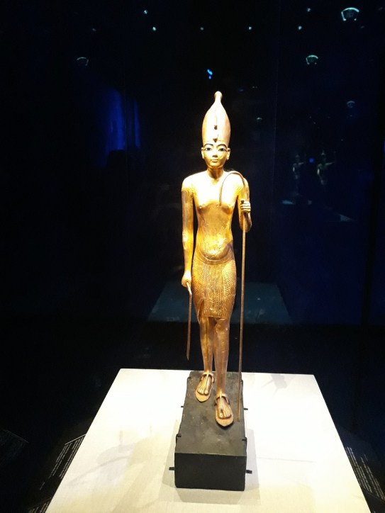 Toutânkhamon, le trésor du Pharaon est une exposition « Waouh » dont on sort émerveillé par la richesse des objets exposés, même si la magnifique statue qui sert pour les supports de communication est en réalité de petite taille et que le sarcophage, trop fragile, n’a pas fait le déplacement. Pour l’avoir vu deux fois, la première à l’ouverture, puis un vendredi soir fin juin en famille (un « bon plan » d’ailleurs car il y a bien moins de monde qu’un mercredi) j’en suis sortie déçue par la faiblesse du propos scientifique. A grands renforts de scénographie grand public – notamment le court film introductif – le public révise son cours de sixième sur l’Egypte et entreprend un voyage dans l’au-delà, et aura retenu qu’en Egypte, on meurt deux fois: lorsque l’on décède et lorsque plus personne ne prononce le nom du défunt. Une approche qui amène, au passage à réfléchir sur les millions d’êtres humains qui nous ont précédés sur terre.
