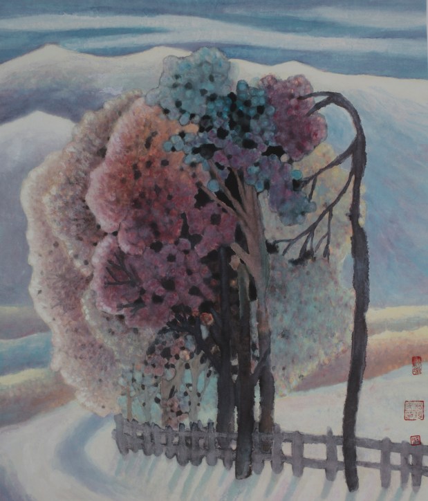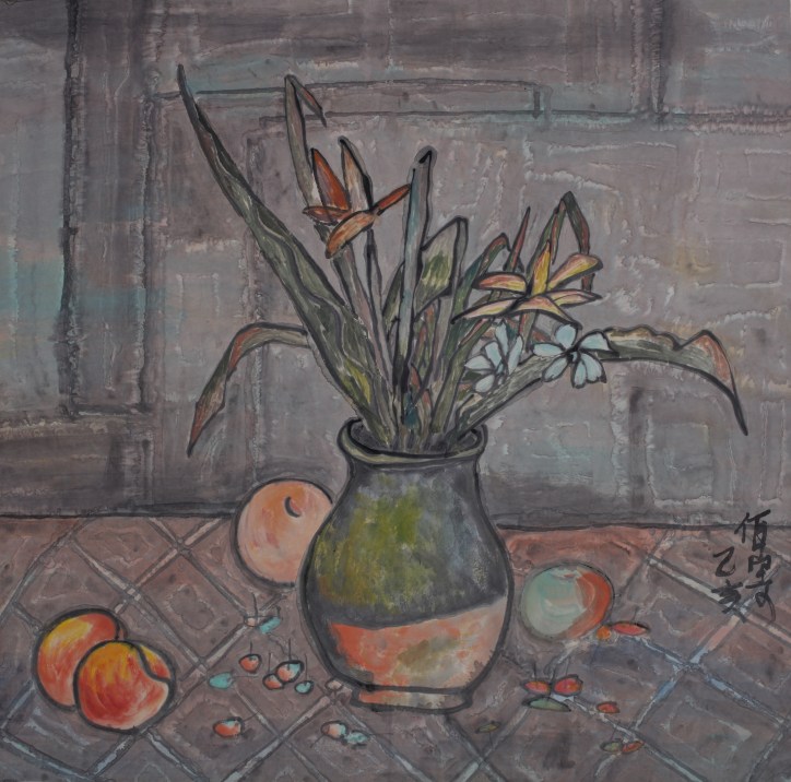 Le visiteur y découvre l’importance des lotus, fleurs de la paix, des rituels du Nouvel an chinois et leurs oignons de narcisse, fleur de divinité. Un art « élégant » s’y dévoile, selon la formule chère à Baudelaire. Yang Ermin est un peintre érudit qui aime Cézanne, Gauguin et dont l’utilisation de la photographie comme support ou inspiration de certaines de ces peintures donne des œuvres remplies de finesse. J’ai personnellement beaucoup aimé cette peinture usée qui dégage une certaine sérénité.