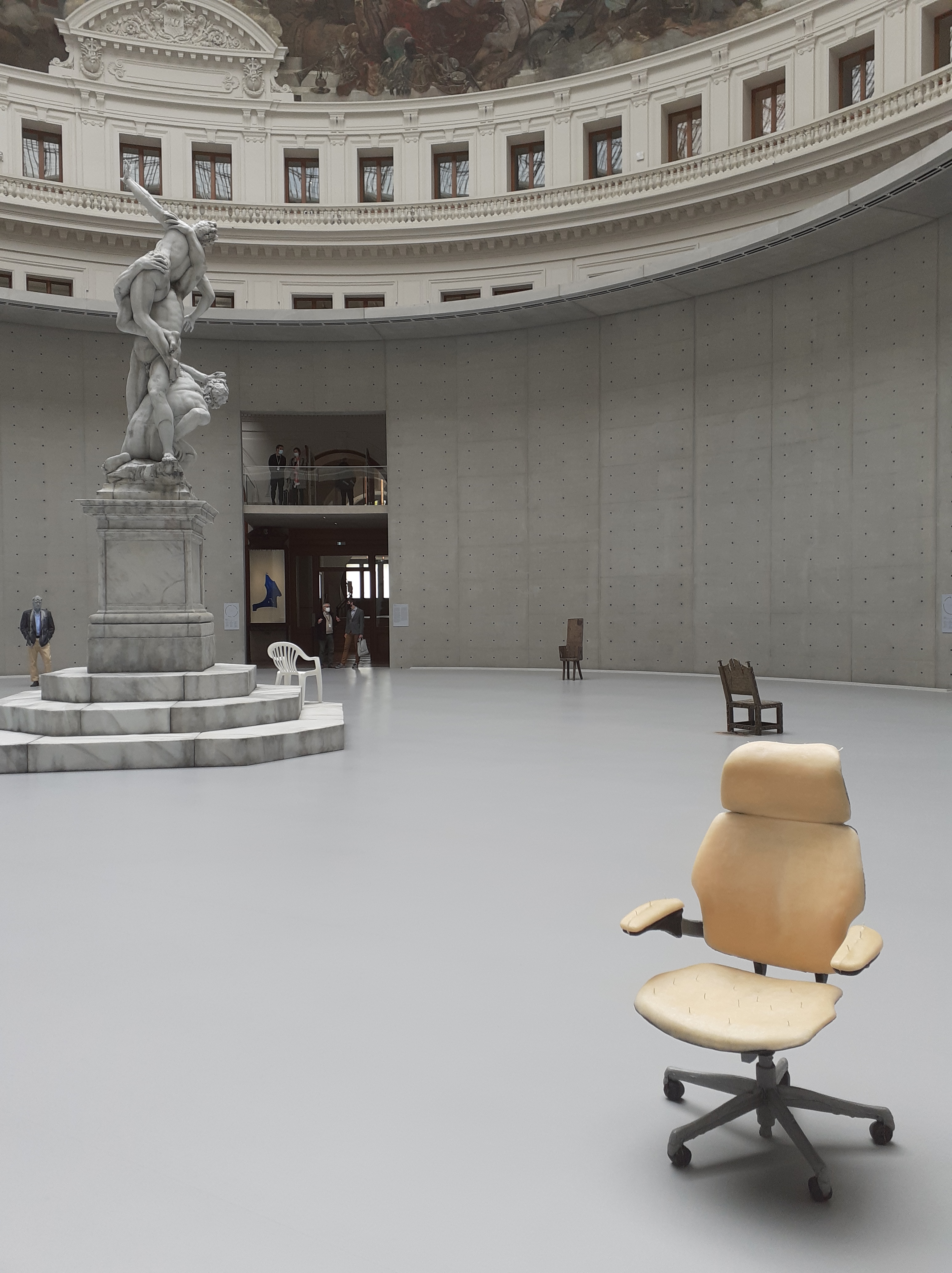 Si la réplique en cire, dans la Rotonde, de L’Enlèvement des Sabines de Giambologna par Urs Fischer – Untiled, 2011 – m’avait laissée perplexe en mai, elle est désormais en partie fondue et interroge sur notre rapport au temps. Les autres objets de la rotonde – reproductions de sièges d’avion ou de chaises africaines artisanales – sont également abîmés par l’action du feu, qu’ils soient des produits de la standardisation de notre société et produits en masse, ou au contraire l’émanation d’une culture locale.