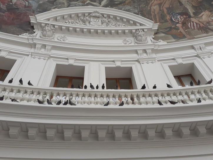 La présence de pigeons naturalisés dans cette rotonde rappelle à la fois les pigeons voyageurs, les Oiseaux d’Hitchcock, mais également les volatiles qu’on pouvait apercevoir avant la rénovation du lieu. En faisant entrer l’extérieur à l’intérieur par cette œuvre discrète, c’est notre rapport à l’espace qui est interrogé.