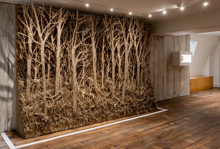Eva Jospin nous emmène ensuite, au gré des salles du musée de la chasse et de la nature dans un ailleurs peuplé de pergolas, nymphées, lianes et plantes éphémères. Les thèmes de prédilection de l’artiste sont présents: jardins baroques italiens, grottes féériques et rocailles fantastiques du XVIII°s.