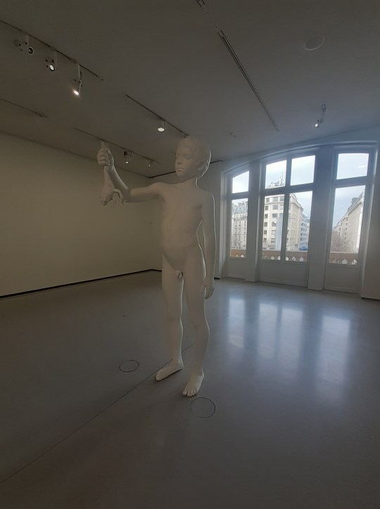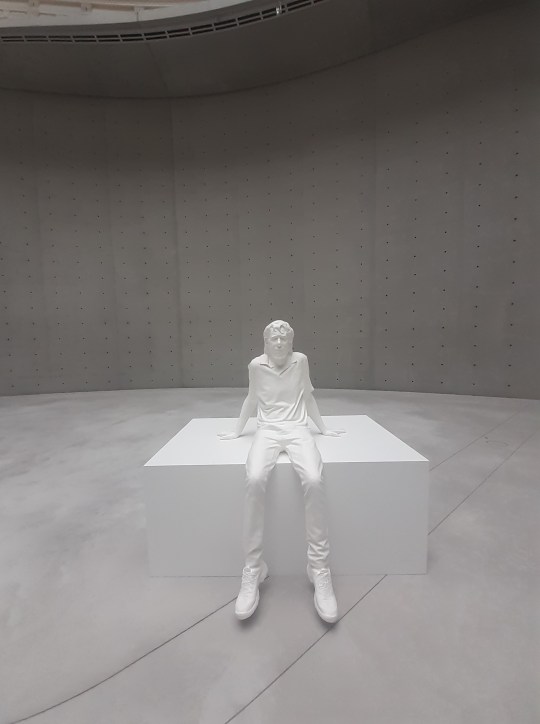 Ainsi, sous la Rotonde de la Bourse de commerce, alors que le centre est laissé volontairement vide, son Autoportrait de 2021, sculpture en papier aquarelle, où il semble attendre quelque chose, montre un degré de détail poussé dans les mains et leurs rides alors que d’autres parties sont bien plus lisses.