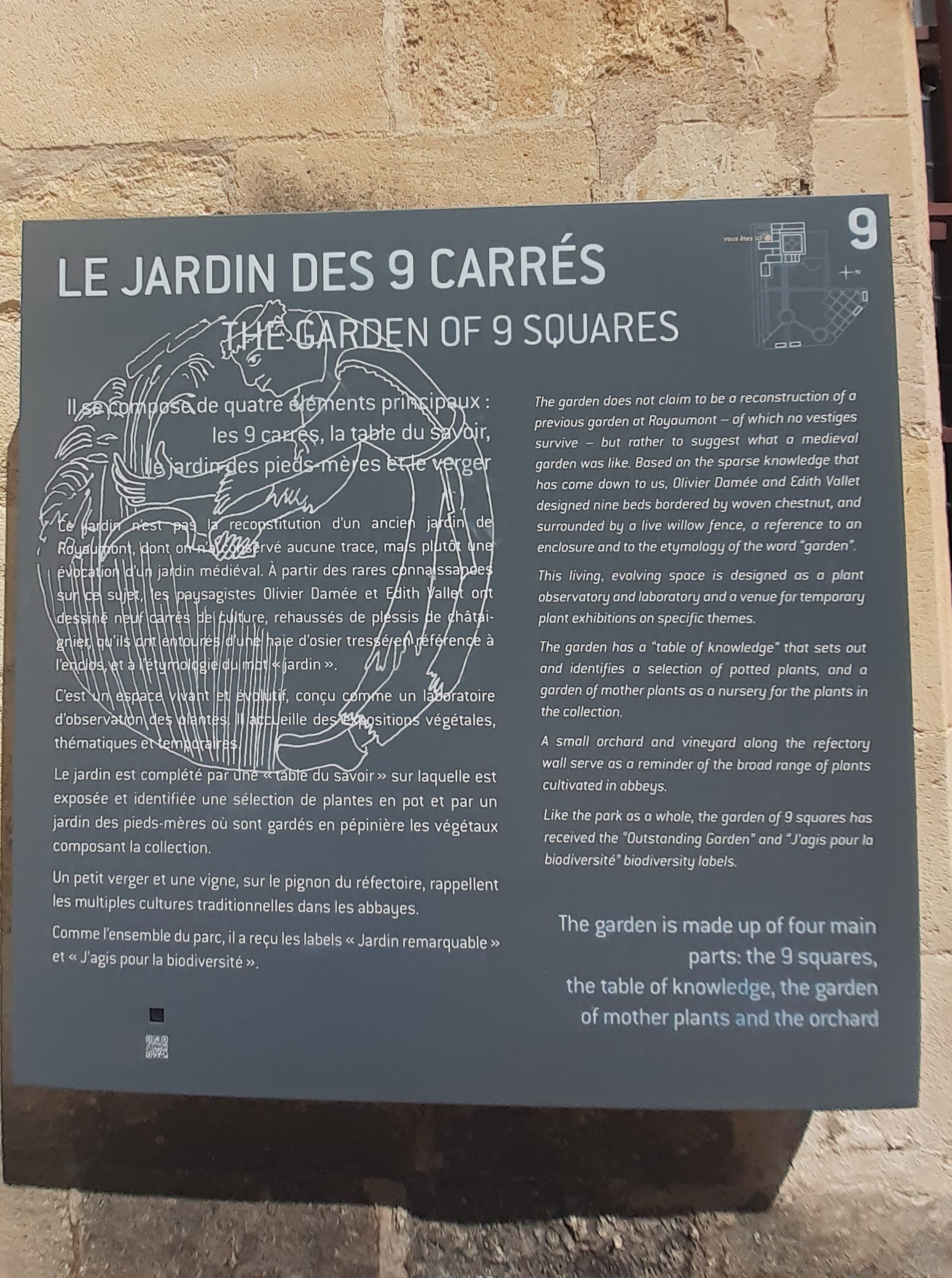 « Civilisation du bois » selon l’expression de Michel Pastoureau, le Moyen-Âge emploie quotidiennement le bois: fêtes de villages, culture de fruitiers dans les domaines royaux, monastères et vergers, chasses dans les bosquets… L’imaginaire populaire garde également en mémoire Saint Louis rendant justice sous son chêne à Vincennes. C’est donc une déambulation en 6 étapes qui nous est proposée, de l’arbre isolé et solitaire, point de repère, à la sylve ou forêt profonde, lieu de refuge des brigands. La table du savoir, plateau d’amarante d’un seul tenant de 17m venu de Guyane, présente les végétaux du jardin des 9 carrés, isolés et étiquetés en pots. Une lecture à plusieurs niveaux est possible selon son âge, son érudition et l’état d’avancement du jardin (il est en effet compliqué actuellement de se projeter dans la forêt profonde): le petit chaperon rouge, Robin des Bois, Tristan et Yseult s’enfuyant dans la forêt profonde, Yvain ou le chevalier au lion vous donnent rendez-vous par la pensée à l’abbaye de Royaumont.