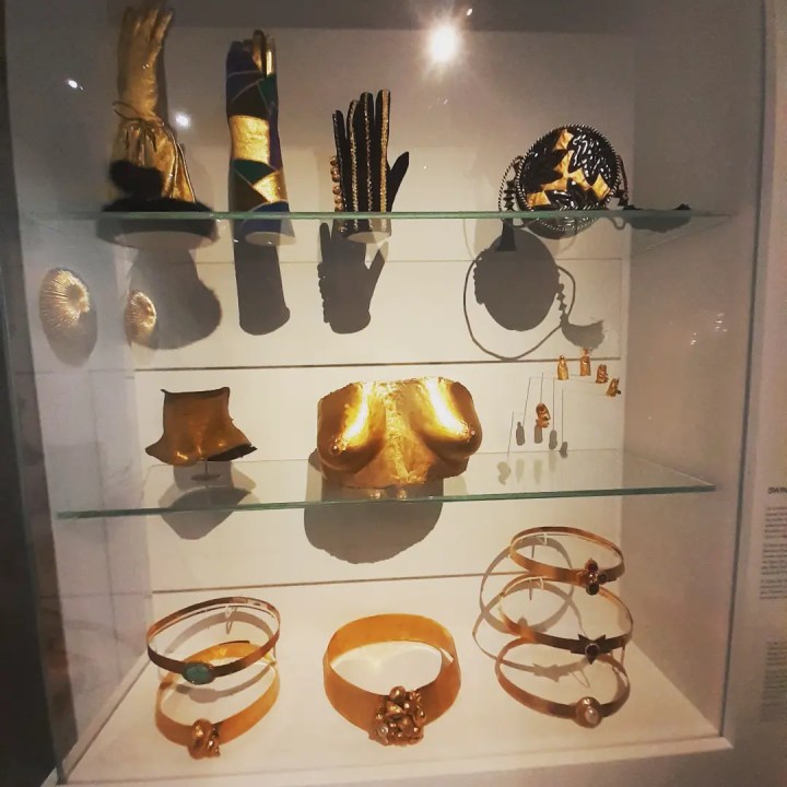 Loin de se cantonner à l’exposition de beaux objets – ce qui permettrait déjà de se former l’œil et de reconnaître une coupe Yves Saint Laurent des autres couturiers – cette exposition s’interroge également sur la couleur du doré à travers les siècles et l’utilisation qu’en fit le couturier. Longtemps l’apanage des puissants et des divinités l’or – et la couleur qui en découle – connaît avec Yves Saint Laurent un détournement dès le défilé haute couture printemps été 1962 avec un caban de lainage bleu emprunté au vestiaire marin et paré de boutons dorés dont le relief évoque le cordage d’un bateau. Les boutons deviennent chez Yves Saint Laurent de véritables bijoux que l’on retrouve au fil des collections du couturier. Ils illuminent un ensemble aux tonalités sombres ou renforcent l’extravagance d’un accessoire de tête.