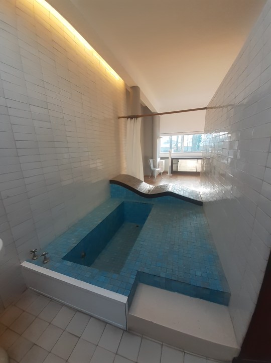 Cette expérience virtuelle a le mérite selon moi de donner un peu « de corps » à une maison qui, quoique repeinte récemment, reste vide. En nous immergeant dans la construction de la Villa Savoye, le visiteur peut ainsi s’imaginer les choix architecturaux, les déboires aussi – « il peut dans ma chambre » (car le toit plat a rapidement posé des problèmes d’étanchéité) et balayer l’histoire de sa construction – des premières esquisses à la réalisation finale. J’ai trouvé intéressant de rappeler que la maison avait été notamment construite pour pouvoir rentrer la voiture au rez-de-chaussée : le mur vitré courbe du vestibule est défini par le rayon de braquage d’une automobile de 1930